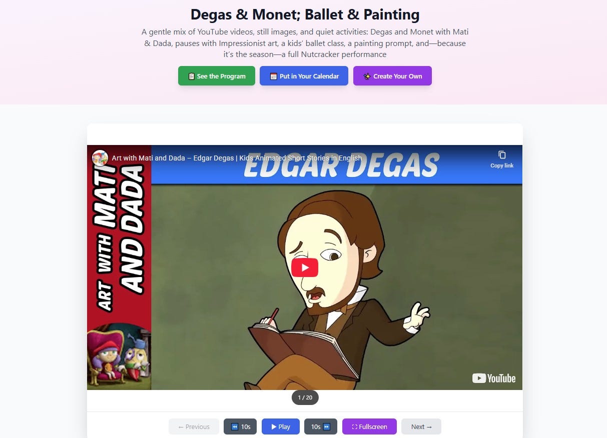 A gentle curation of YouTube videos, still images, and quiet activities: